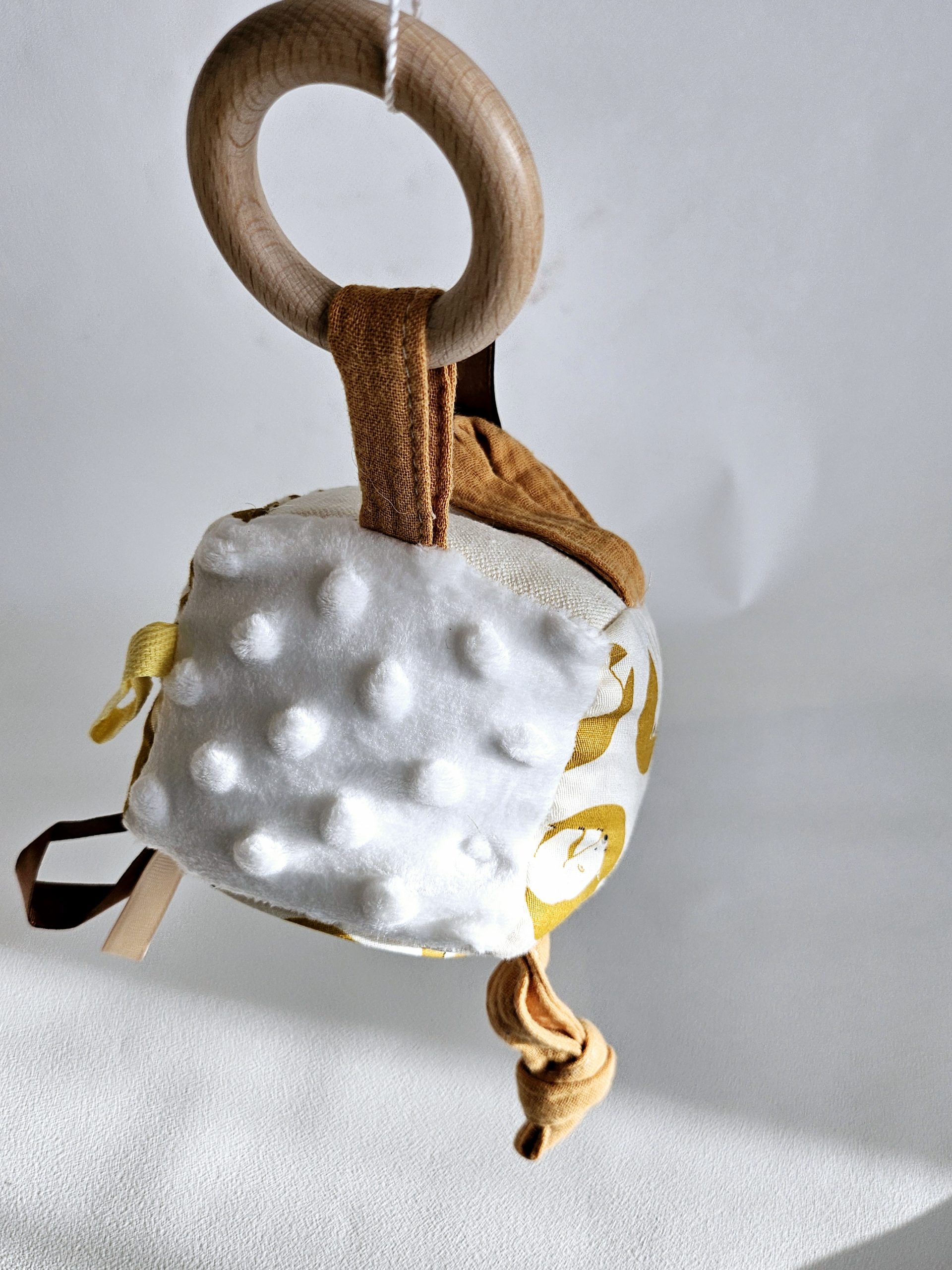 Chaque face propose une nouvelle expérience : une surface douce ,une en relief et des couleurs vives